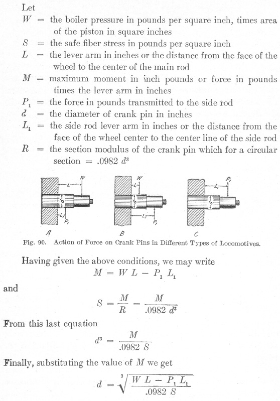 This equation may be used in finding the diameter of the main crank pin on any type of locomotive when the loads and lever arms are known and the safe fiber stress has been assumed. It should be remembered, however, that for an 8-wheeled locomotive it is